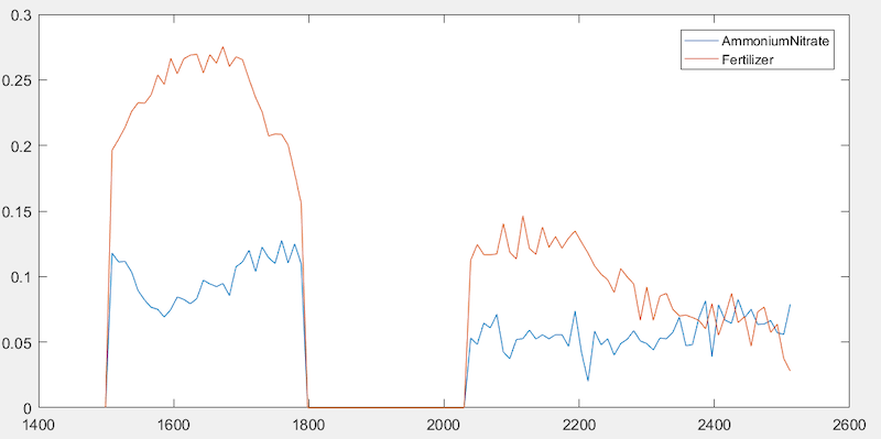 And yet, the spectral signatures (Figure 2) are completely different, allowing the ammonium nitrate agricultural fertilizer to be consistently discriminated from the lawn fertilizer.